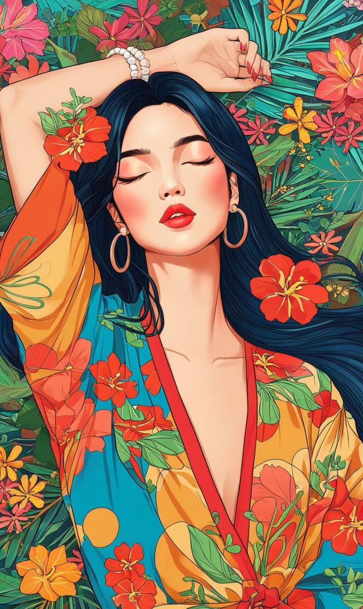تصویر زیبا از دختری بر روی گل ها به همراه ۲۰ ترکیب رنگ - سه سایز قلمو و بوم نقاشی با کیفیت مناسب
