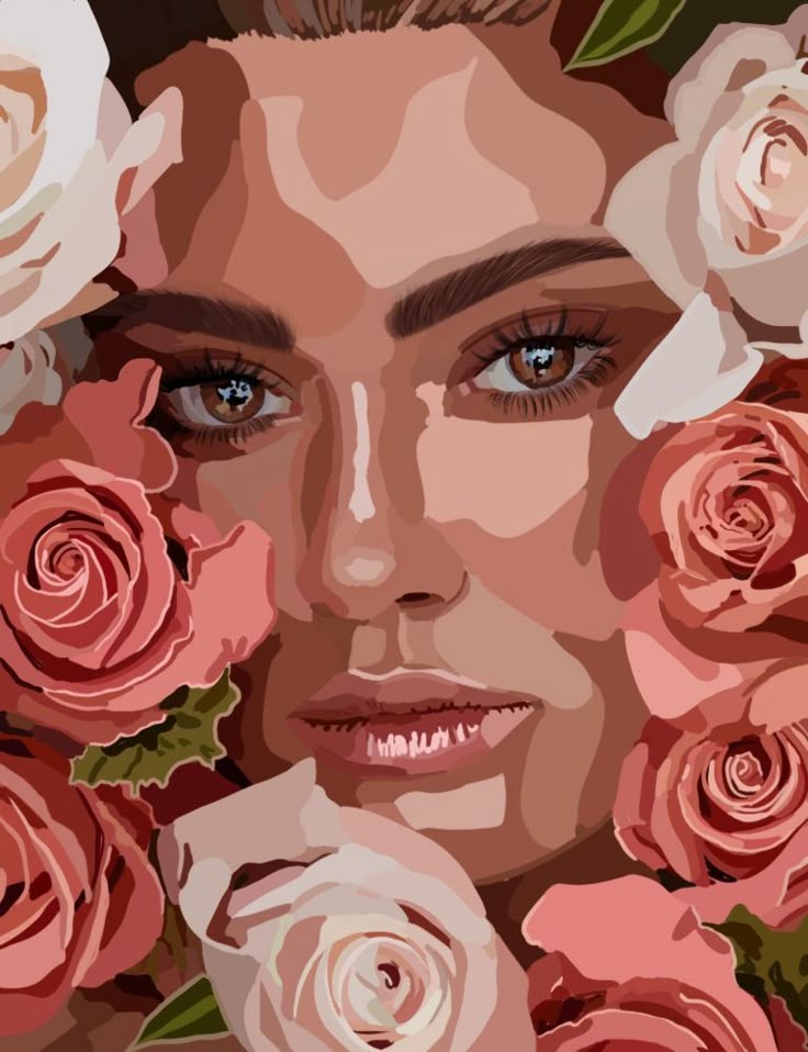 کیت رنگ آمیزی بزرگسالان روی بوم از پرترهای هنری از چهره زنی که با گلهای رز صورتی و سفید احاطه شده؛ زیبا، رمانتیک و پر از لطافت.
