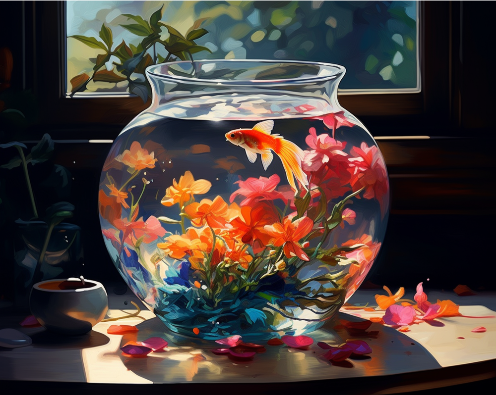 کیت رنگ آمیزی با اعداد از تنگ شیشهای پر از گلهای رنگارنگ نارنجی و صورتی با یک ماهی قرمز شناور؛ نور خورشید از پنجره میتابد و حس آرامش و زیبایی بهاری میدهد.
