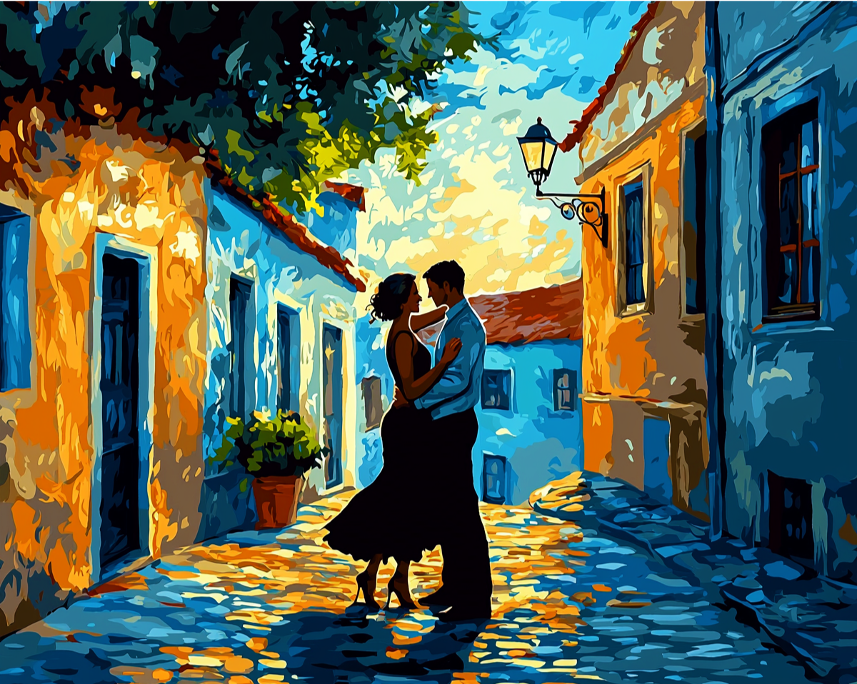 زوجی در کوچهای قدیمی با دیوارهای آبی و نور طلایی غروب، محکم در آغوش هم، انگار دنیا فقط مال آنهاست.
