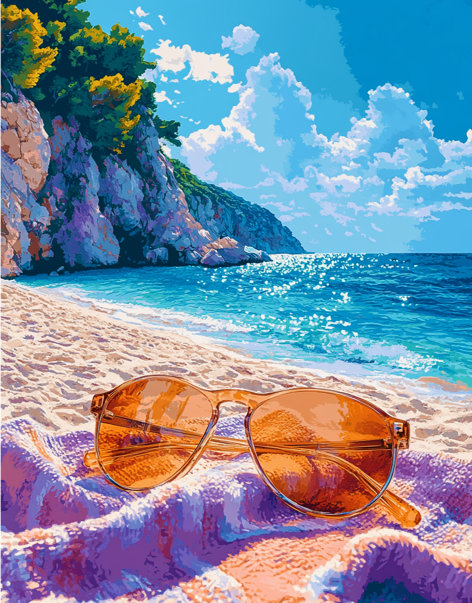 عینک آفتابی روی حولهای رنگی در ساحل درخشان، با موجهای آرام و آسمانی آبی.