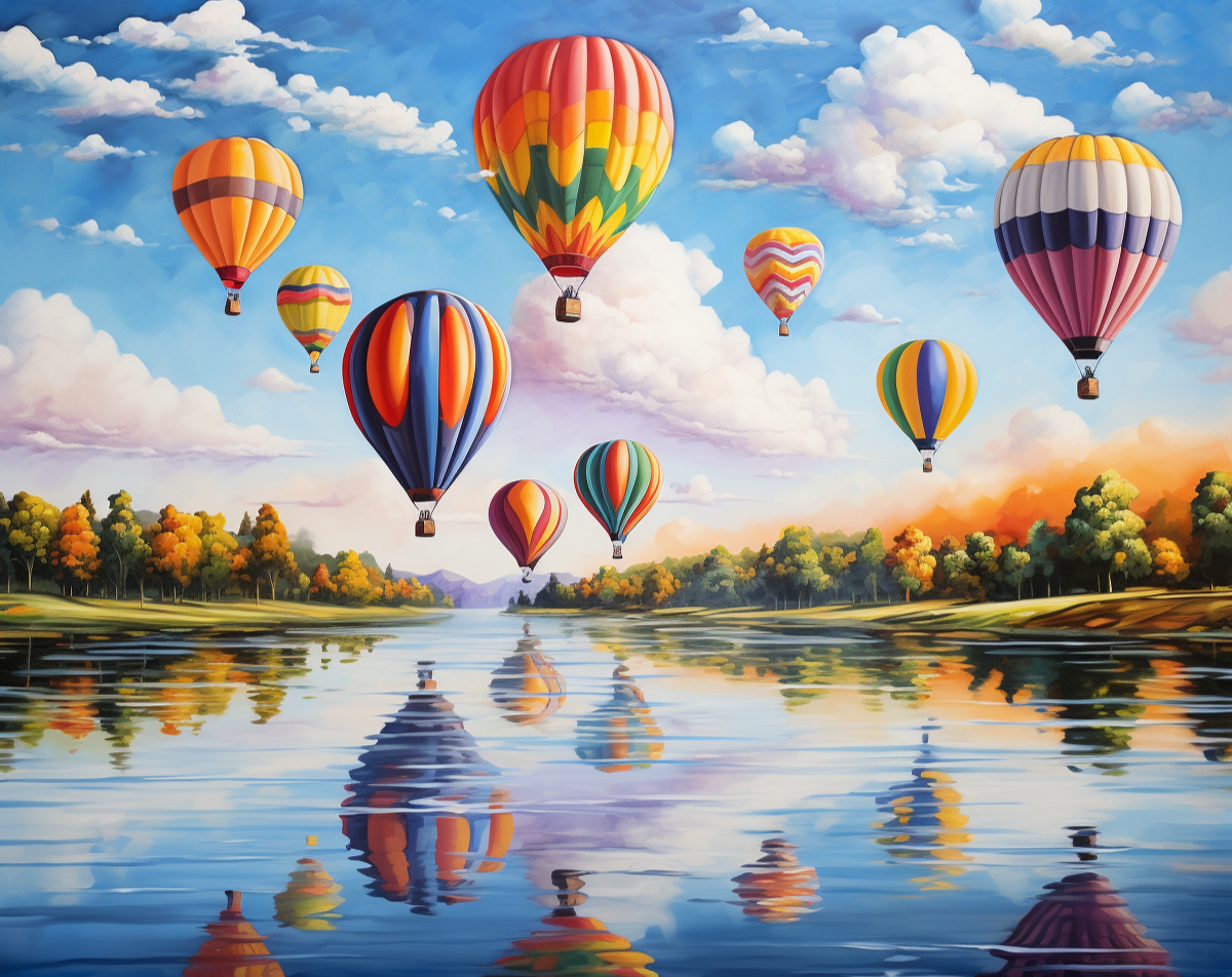 بالونهای رنگارنگ بر فراز دریاچهای آرام، در جستوجوی آزادی و آرامش در میان ابرهای روشن آسمان.