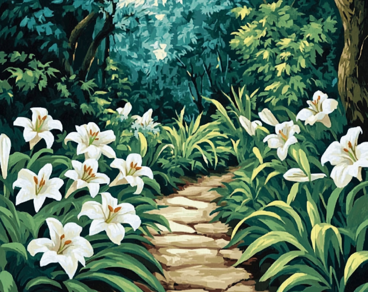 مسیر سنگفرشی باریک میان درختان و سوسنهای سفید، در فضایی آرام و دلانگیز.