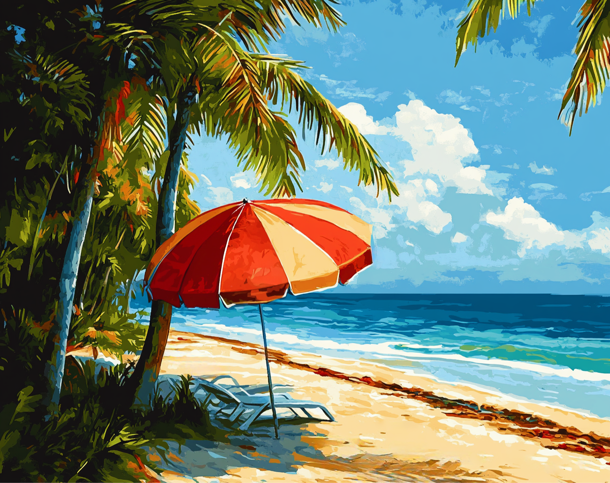 چتر قرمز و صندلیها زیر نخلها، کنار دریا و آسمانی آبی؛ تصویری از آرامش و گرمای تابستان.