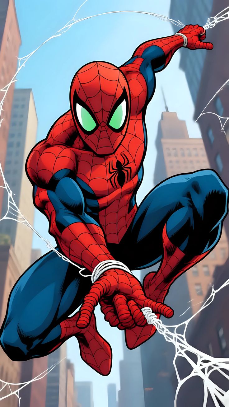 مرد عنکبوتی با لباس کلاسیک قرمز-آبی در حال پرش میان آسمانخراشها، تارهای سفید در هوا؛ نماد چابکی و قهرمانی نیویورک.