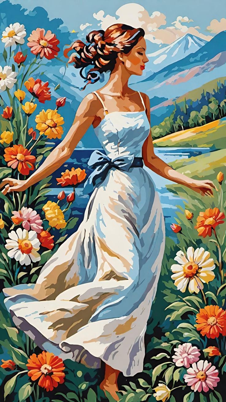دختری با لباس سفید و موهای مواج در میان گلهای رنگارنگ، با کوههای پوشیده از برف و دریاچه آرام در پسزمینه بهشتی.
