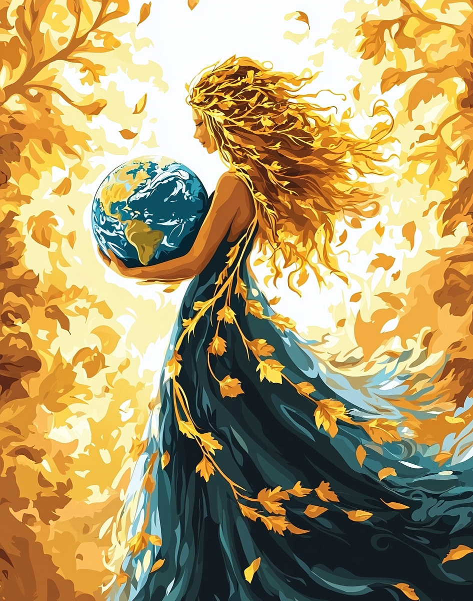 نقاشی زنی با لباس و موهایی با برگ های پاییزی که پاییز را به زمین میبخشد