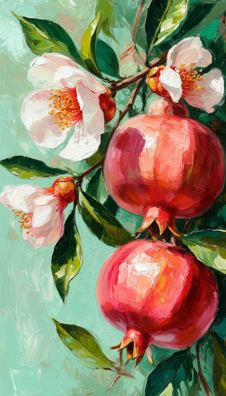 کیت رنگ آمیزی با اعداد دو انار رسیده و براق در کنار شکوفههای سفید و برگهای سبز روی زمینه فیروزهای؛ نماد باروری، یلدا و زیبایی ایرانی.