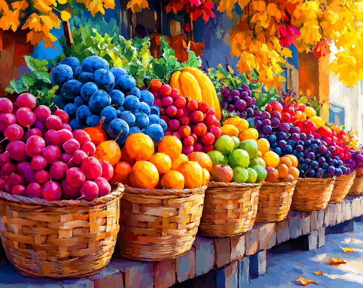 سبدهایی پر از انگور، پرتقال و سیب در کنار هم چیده شدهاند. رنگهای زنده و ترکیب گرم اثر، حس فراوانی و نشاط زندگی را منتقل میکند.