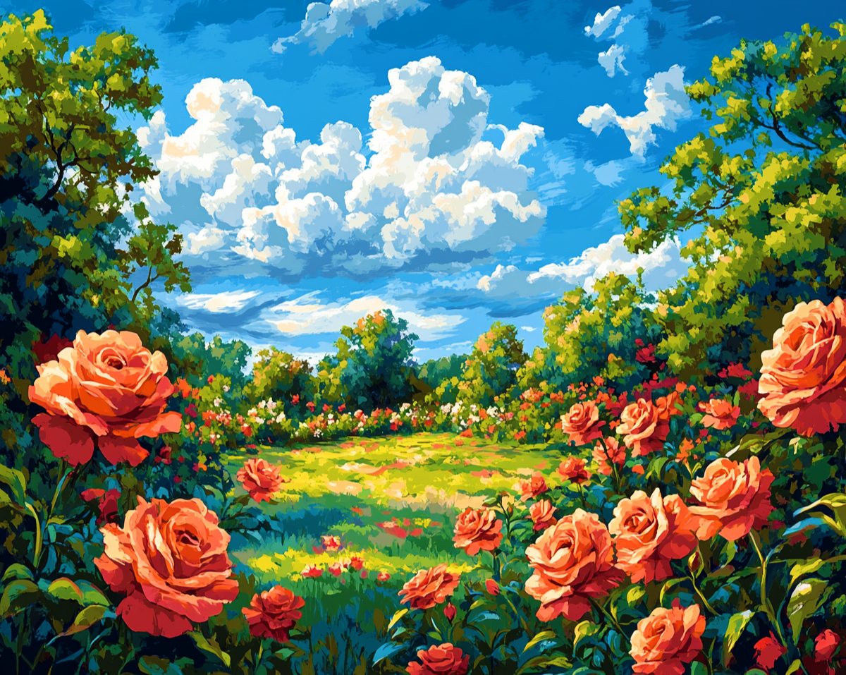 باغی وسیع از رزهای نارنجی زیر آسمان آبی روشن و ابرهای پُرپُشت.