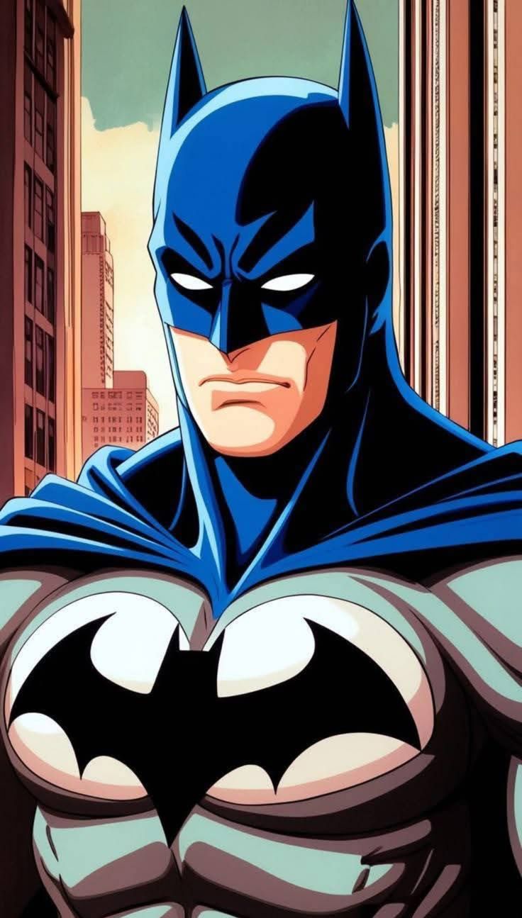بتمن با نگاه جدی و شنل آبی تیره در میان آسمانخراشهای شهر؛ محافظ خاموش شبهای گاتهام.