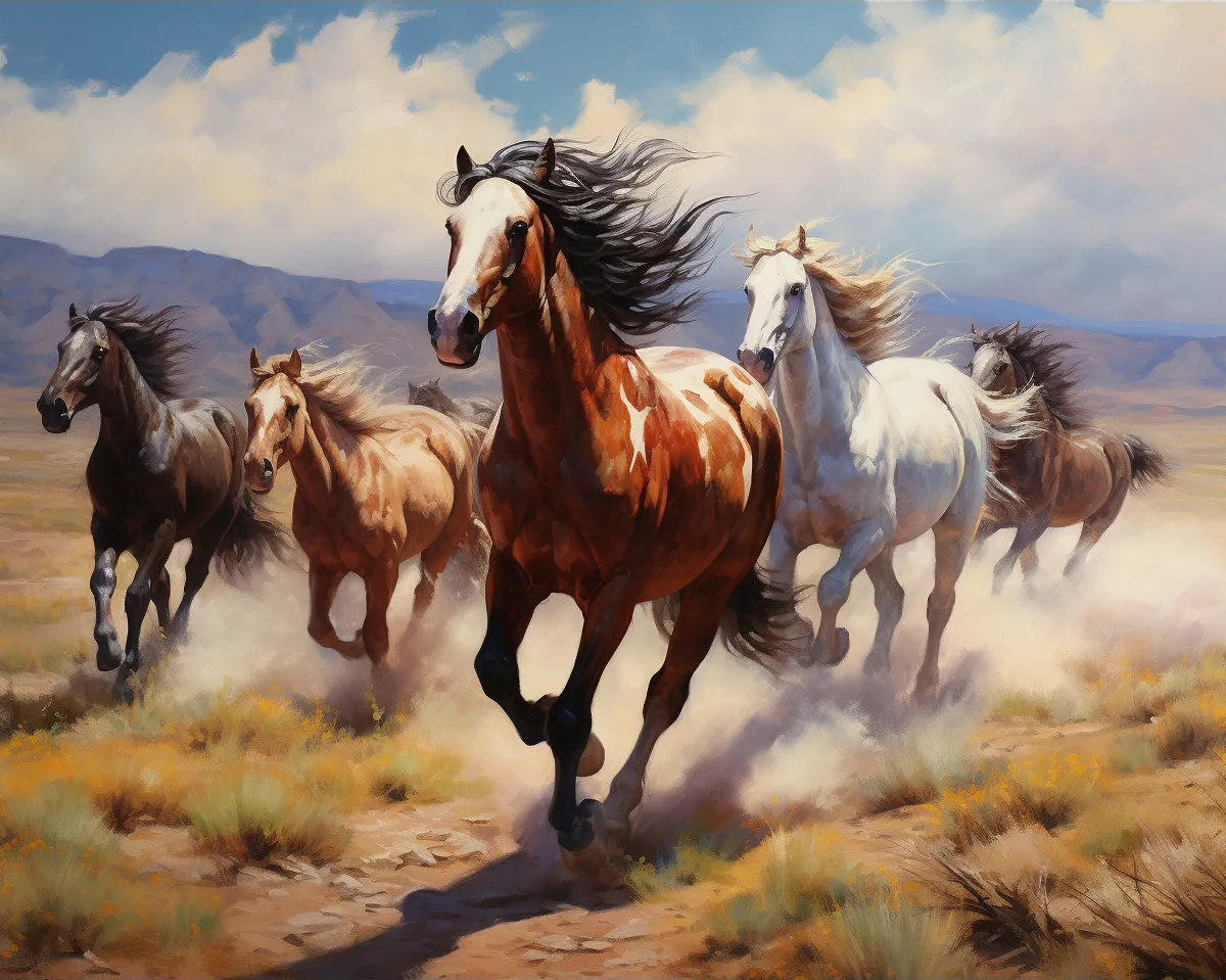 گروهی از اسبها با یالهای رها در باد، در دشتی طلایی میتازند. قدرت، سرعت و روح آزادشان نمادی از زندگی بیمرز و طبیعت بکر