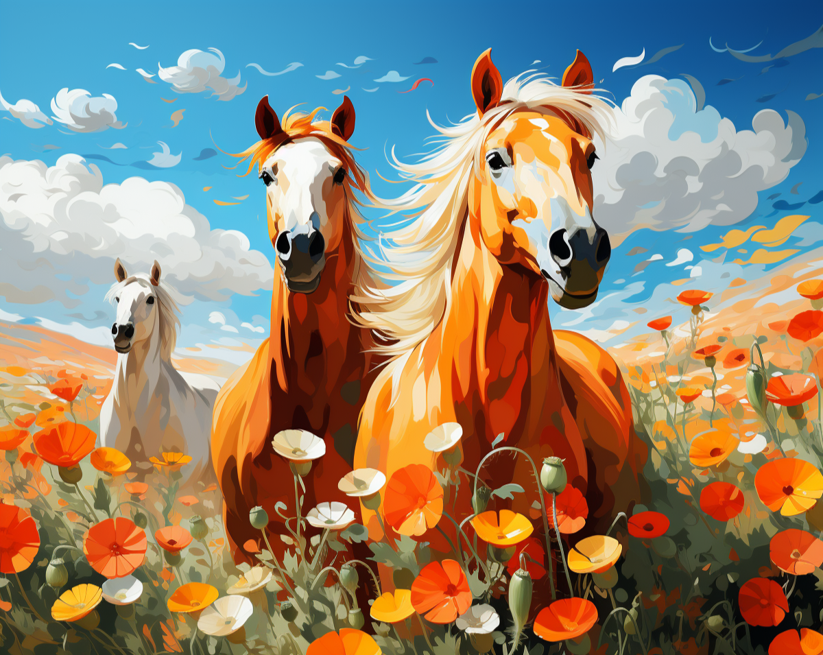 سه اسب در میان دشتی پوشیده از گلهای شقایق شاد و رنگارنگ ایستادهاند. این نقاشی در سبکی مدرن و واقعگرا حس آزادی و نشاط را القا میکند.