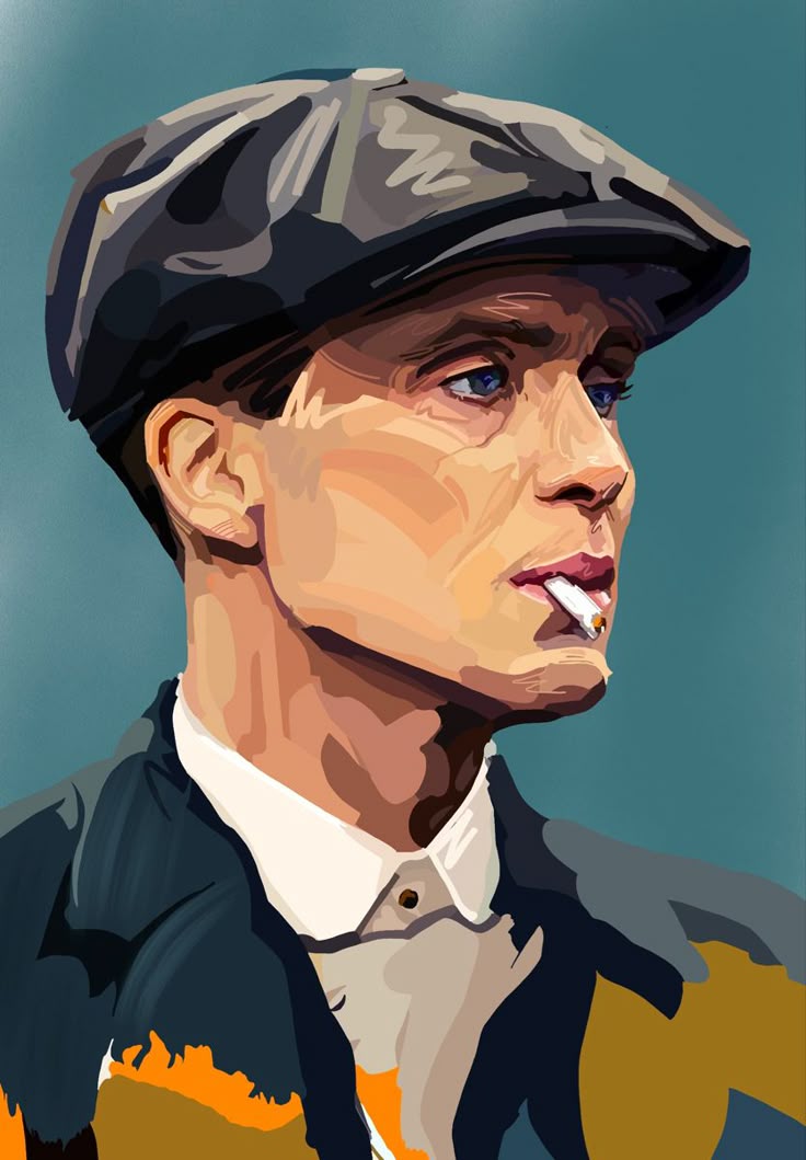 پرترهی از گیلیان مورفین در نقش تامی شلبی با کلاه کج، سیگار به لب و نگاه نافذ؛ حالوهوای پیکی بلایندرز، مرموز و کاریزماتیک.