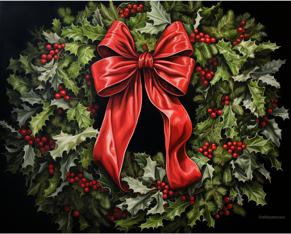 کیت رنگ آمیزی با اعداد حلقهای پر از برگهای سبز، توتهای قرمز و پاپیون ساتن قرمز براق روی زمینه مشکی؛ کلاسیک و باشکوه.