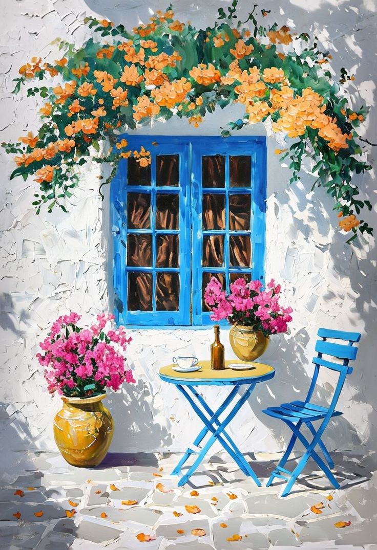 میز و صندلی آبی در کنار پنجرهای رنگین زیر گلهای شکوفا، لحظهای آرام و دلانگیز از صبحی آفتابی و ساده
