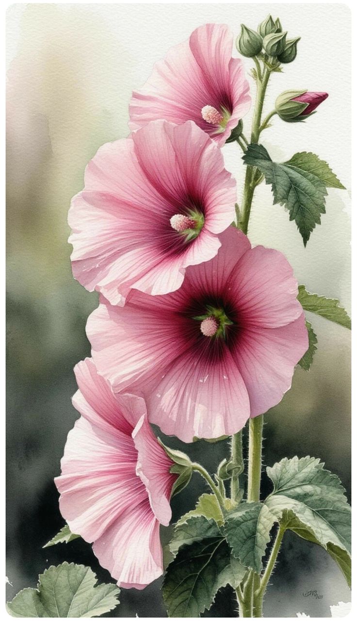 کیت رنگ آمیزی با اعداد چند شاخه ختمی صورتی بلند و لطیف با پسزمینه محو؛ سبک آبرنگ، بسیار زنانه و رمانتیک.