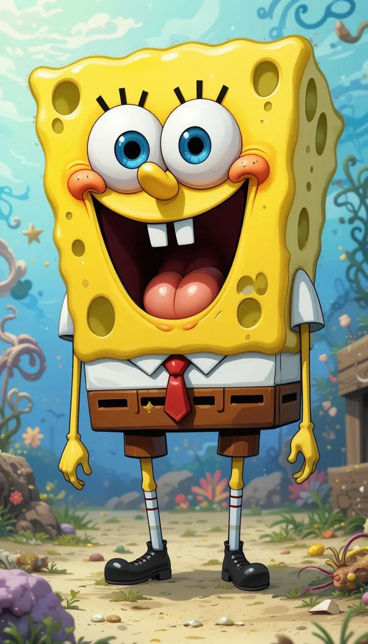 باب اسفنجی با دهان کاملاً باز و چشمان پر از شادی در دنیای زیرآبی رنگارنگ؛ خندهای که همه را خوشحال میکند.