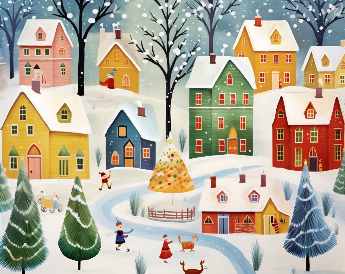 خانههای رنگارنگ پوشیده از برف، بچهها در حال بازی و درخت کریسمس در مرکز؛ شادی ساده زمستان.