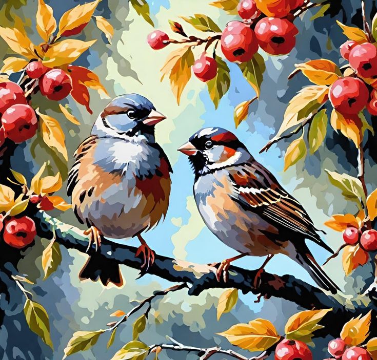 دو گنجشک زیبا روی شاخه پر از میوه های قرمز و برگهای زرد-نارنجی؛ لحظهای آرام و عاشقانه در دل پاییز.