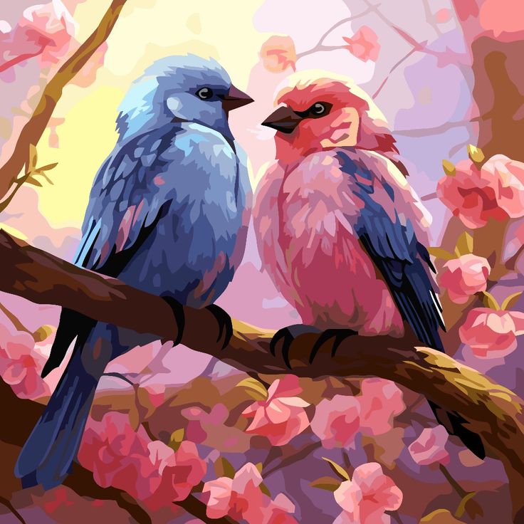 دو پرندهی کوچک، یکی آبی و دیگری صورتی، در میان شاخههای پرگل نشستهاند؛ صحنهای آرام و روشن از طبیعت بهاری.