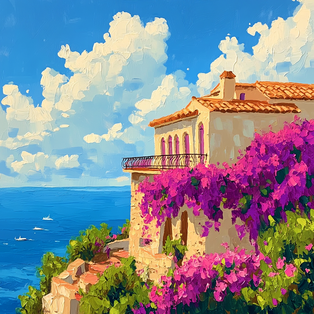 خانهای مدیترانهای پوشیده از گلهای بنفش، مشرف به دریایی آرام و آسمانی روشن.