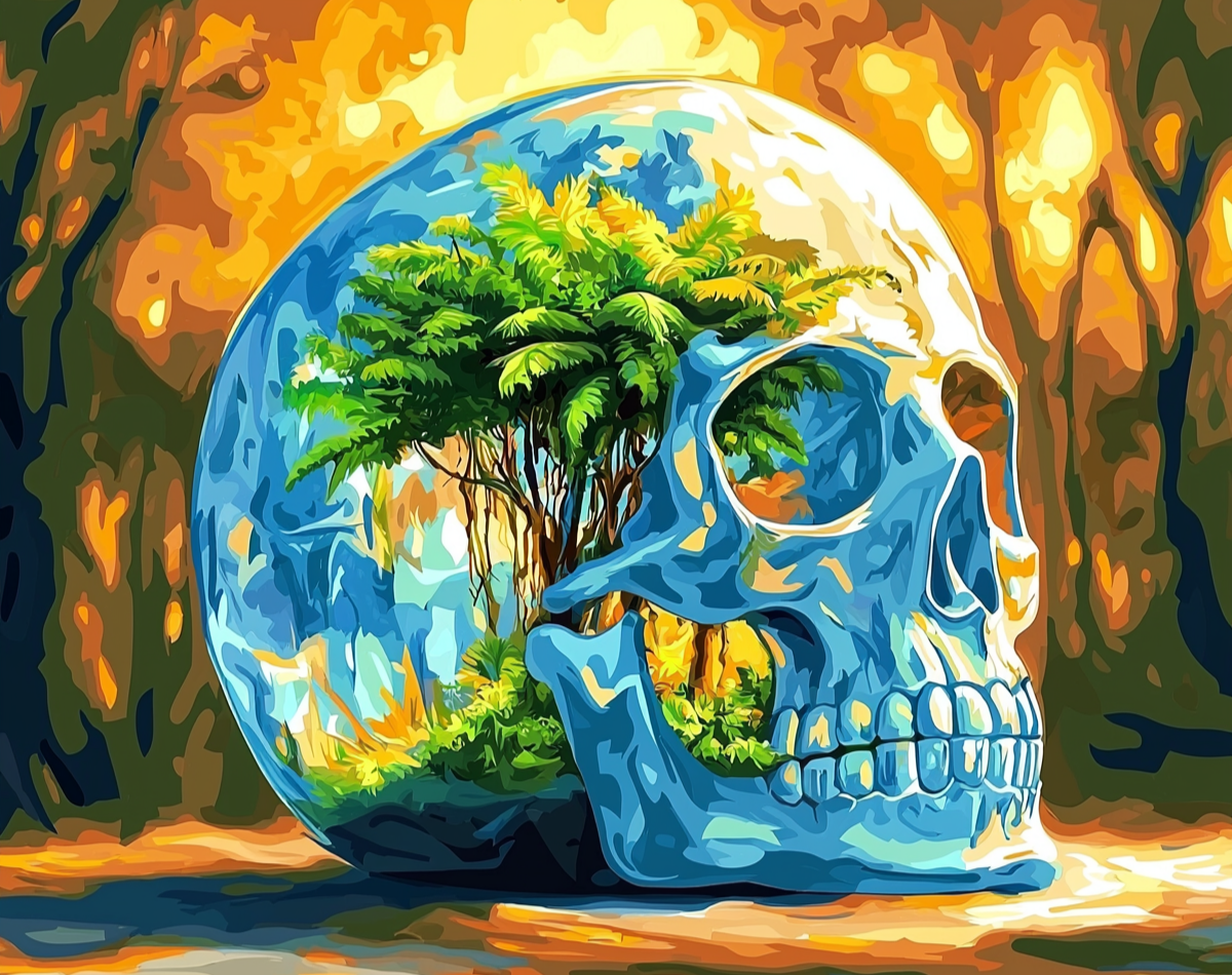 جمجمهای شیشهای که درونش درختان سبز روییدهاند. اثری سوررئالیستی که تضاد میان فناپذیری و زایش طبیعت را به تصویر میکشد.