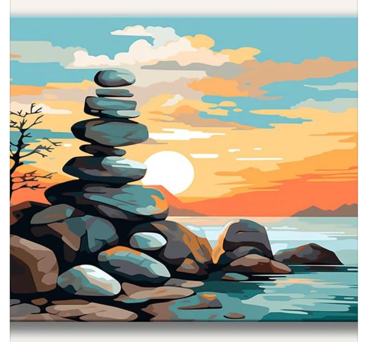 برج تعادلی از سنگهای صاف کنار ساحل آرام، زیر خورشید بزرگ نارنجی که در دریا فرو میرود؛ نماد آرامش و تعادل.