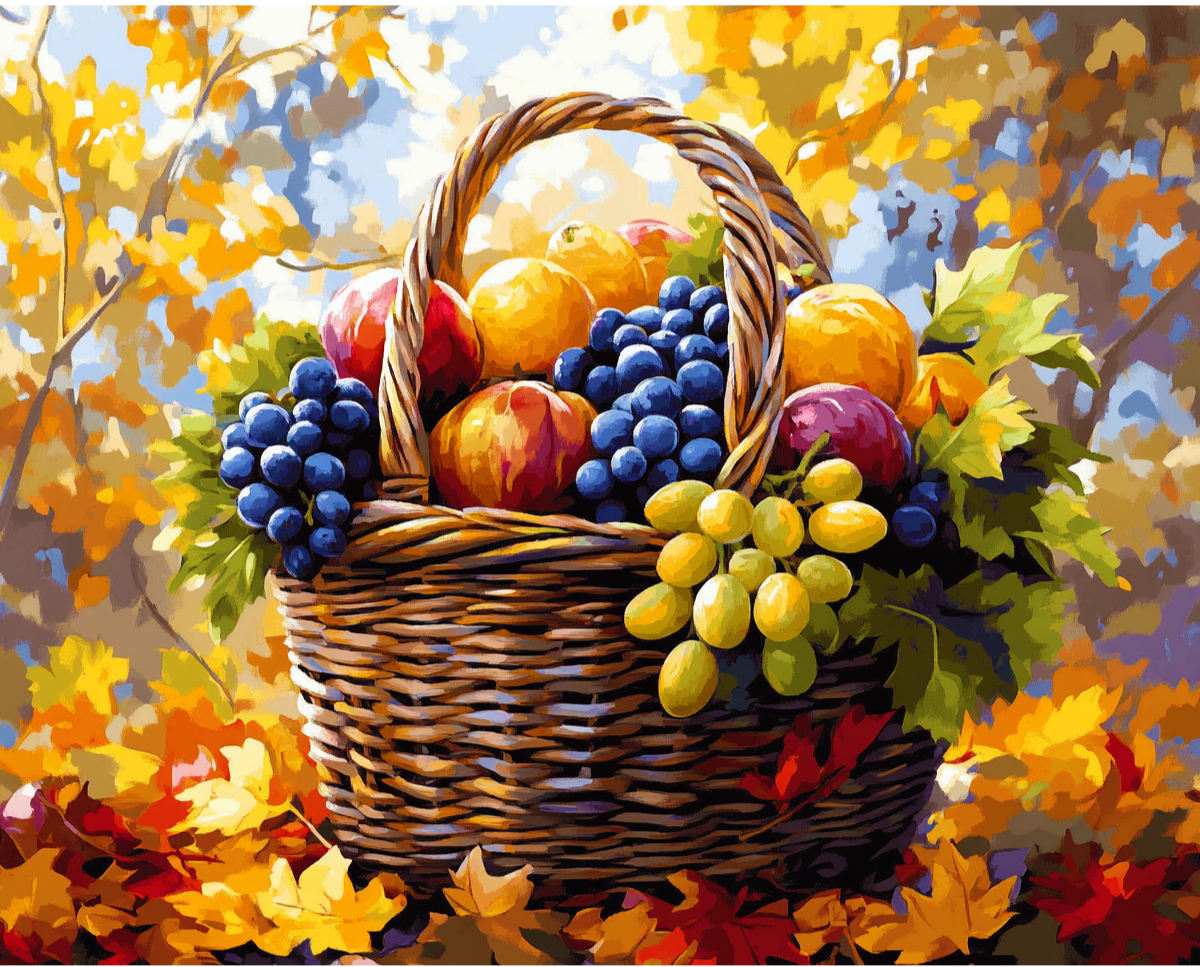 سبدی پر از انگور، سیب و هلو در میان برگهای زرد و سرخ؛ نمادی از نعمت، رنگ و آرامش در روزهای طلایی پاییز.