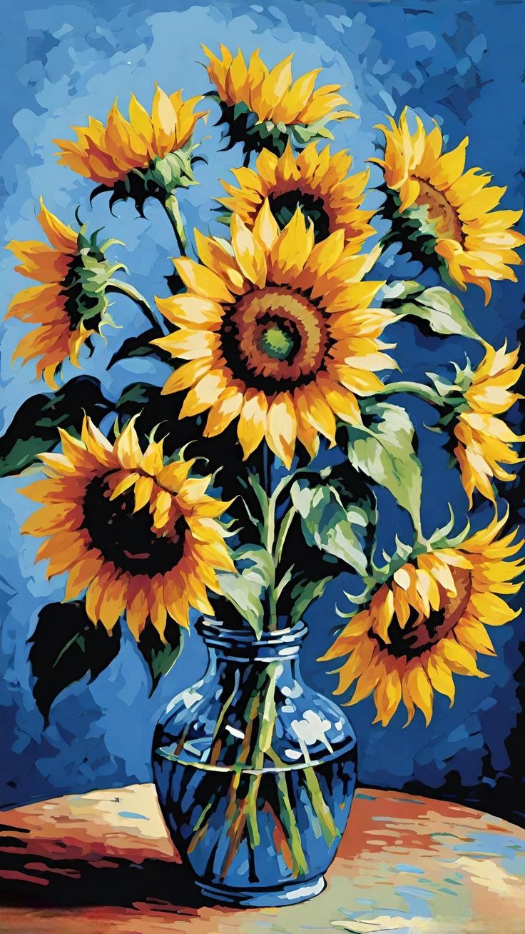 دستهای از آفتابگردانهای درخشان در گلدان شیشهای آبی، روی میز چوبی زیر آسمان عمیق آبی؛ نماد شادی ابدی.