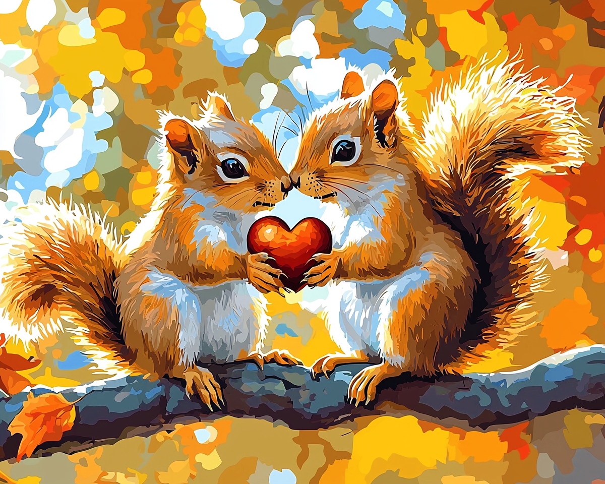 دو سنجاب پشمالوی نارنجی که با نوک بینی به هم چسبیدهاند و قلب قرمز درخشان را با هم نگه داشتهاند، در میان برگهای پاییزی طلایی.
