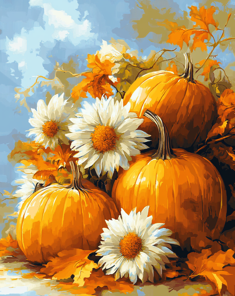 کدوهای نارنجی در کنار گلهای سفید، در میان برگهای زرد، نوایی از گرمای دلانگیز فصل برداشت میسرایند.