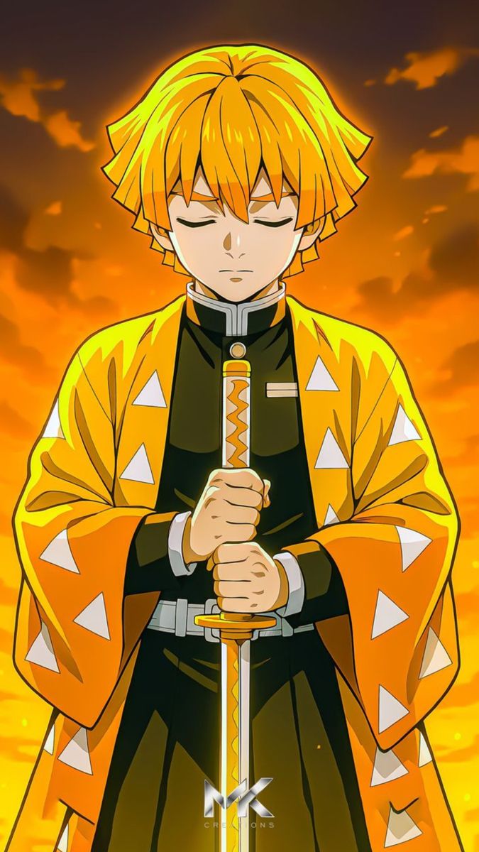 تصویر زنیتسو با چشمان بسته و شمشیر در دست، در میان آسمان آتشین؛ لحظهای از آرامش پیش از طوفان رعد و برق.