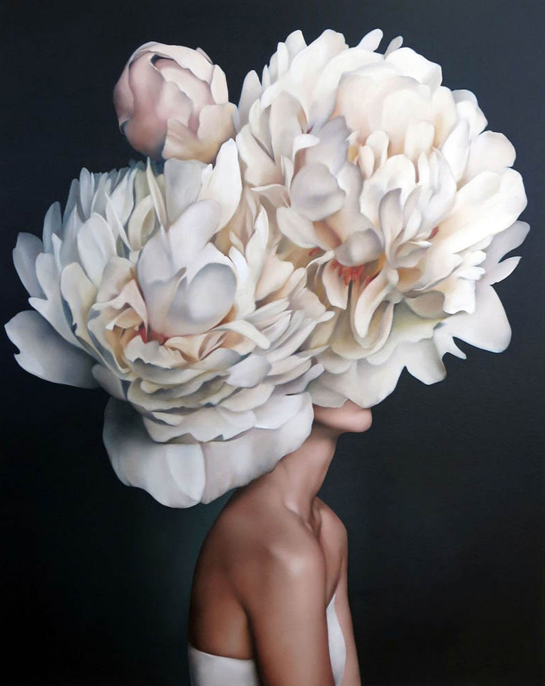 پرترهی زنی که چهرهاش در میان گلهای سفید پنهان است؛ ترکیبی از زیبایی و خیال.