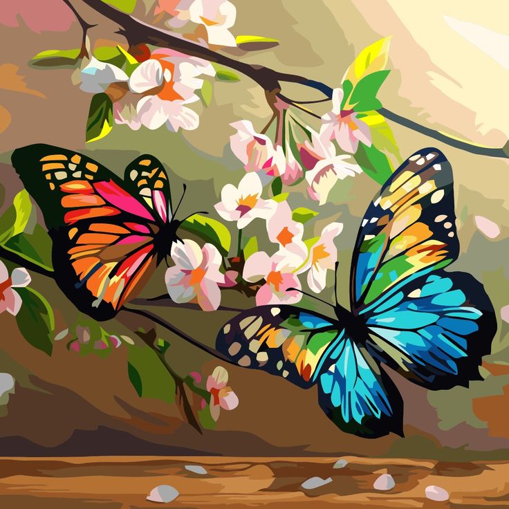 کیت رنگ آمیزی با اعداد تصویری از دو پروانه رنگارنگ روی شاخه شکوفههای صورتی؛ لطیف، عاشقانه و بهاری.