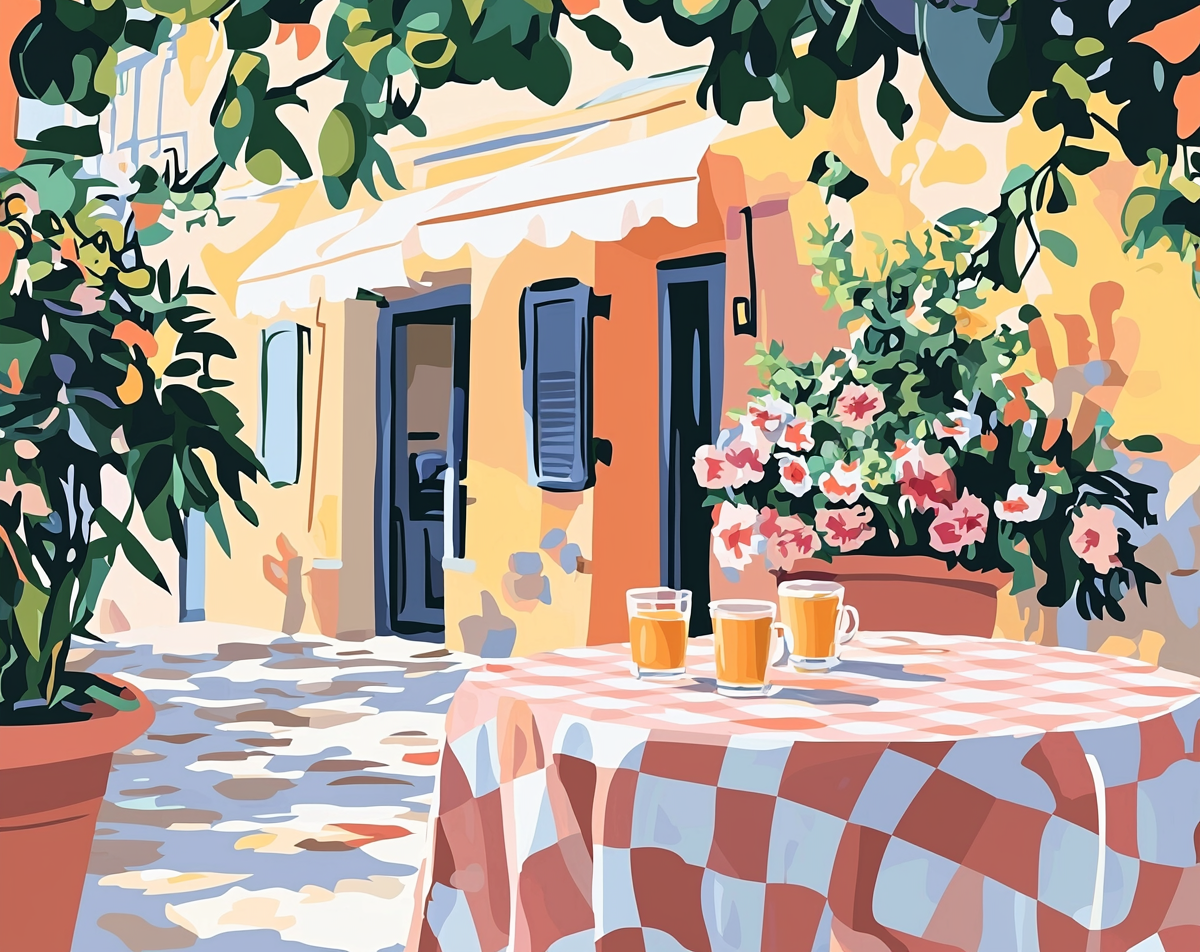 تصویری فانتزی از میزی با پارچه چهارخانه و سه لیوان نوشیدنی در حیاطی آفتابی، در میان گلها و درختان لیمو.