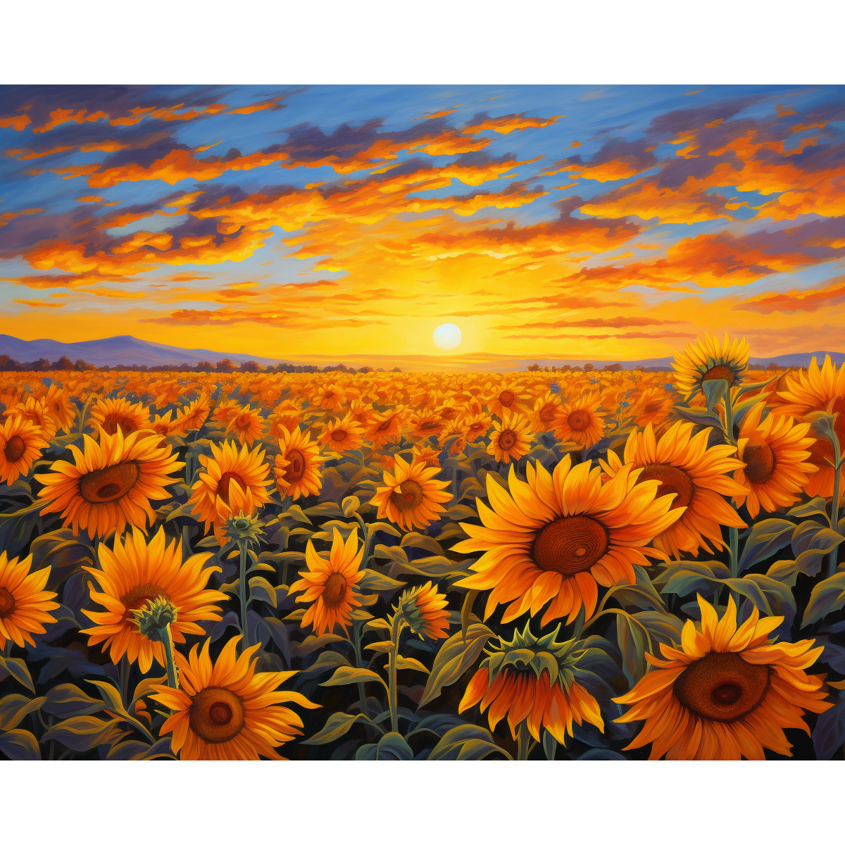 درخشش دشتی گسترده از گلهای آفتابگردان در زیر آسمان طلاییِ سحرگاهی و گرمای خورشید که زندگی و امید را در هر گلبرگ بیدار میکند.