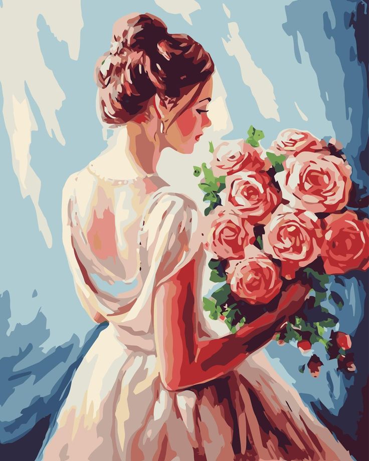 کیت رنگ آمیزی با اعداد دختر جوان با لباس سفید کلاسیک که دستهگل رز صورتی را در آغوش گرفته؛ حس نوستالژیک، عاشقانه و پاکی.