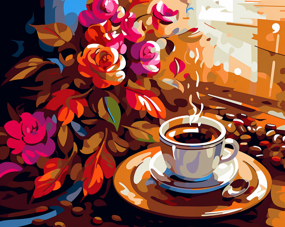 فنجان قهوهی داغ در کنار گلهای رز رنگارنگ، همنوای عطر، گرما و لحظهای شاعرانه.