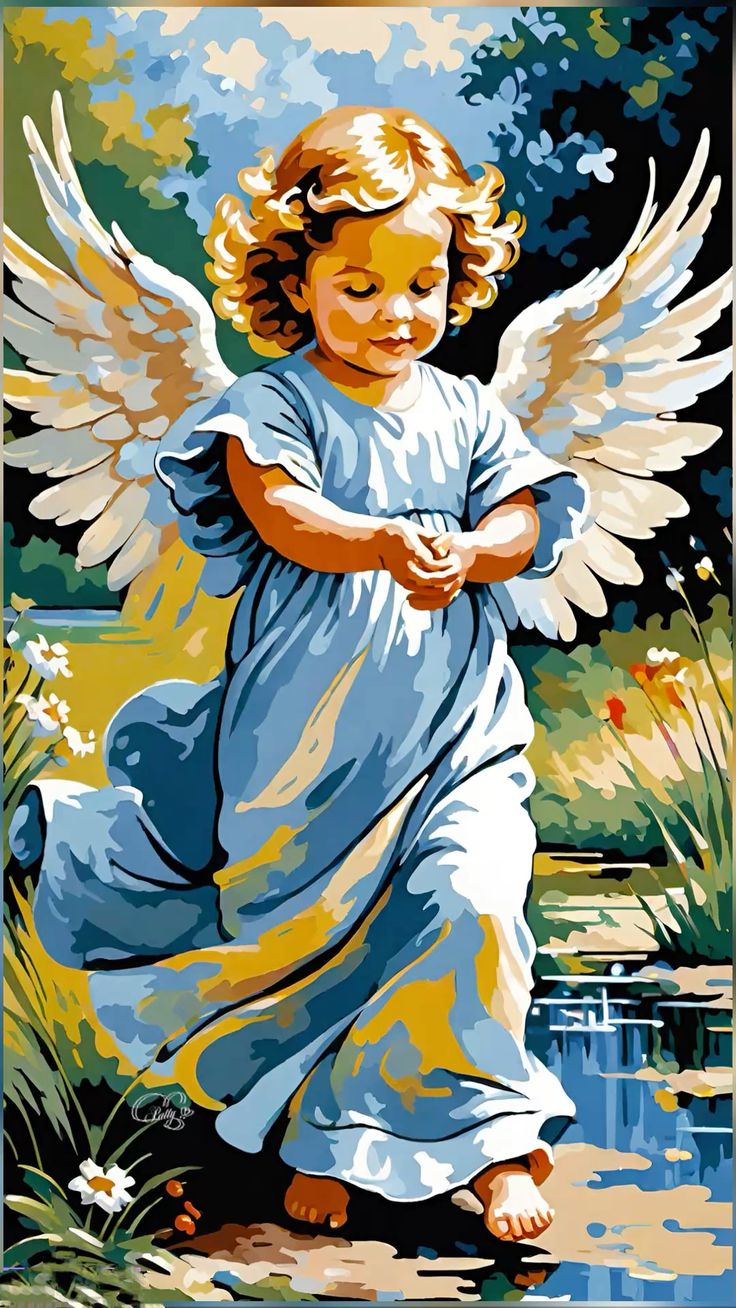 فرشتهای کودک با بالهای سفید و لباس آبی، در حال دعا کنار جویبار و گلهای وحشی؛ نماد معصومیت و نور الهی.