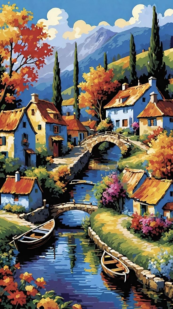 دهکدهای رنگارنگ با خانههای کجومعوج، پل سنگی، قایقهای کوچک؛ درختان پاییزی و رودی که ساکنان دو طرف را جدا و پلهایی که آنها را به هم وصل می کنند. حس تصویری از آرامش روستایی در یک روز طلایی.
