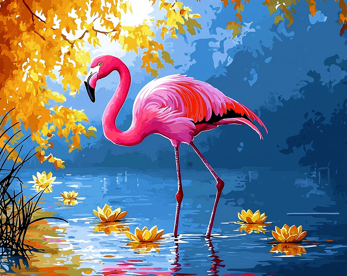 فلامینگوی صورتی باشکوه در آب آرام با نیلوفرهای طلایی، زیر درخت پاییزی درخشان و آسمان آبی مهآلود.