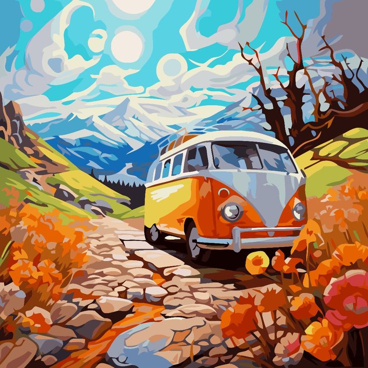 ون کلاسیک نارنجی در جاده کوهستانی پر از گلهای وحشی، زیر آسمان آبی و کوههای دور؛ حس آزادی و سفر بیپایان.