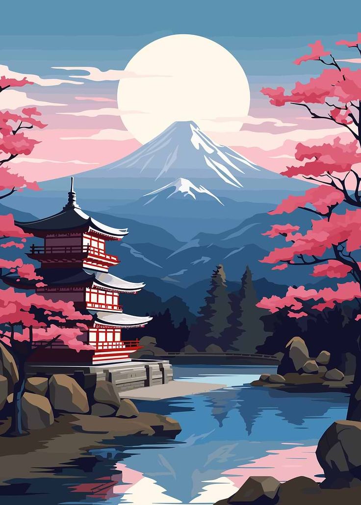 چشماندازی آرام از کوه فوجی با درختان شکوفهزار و معبد سنتی ژاپنی در کنار آب. نقاشی در سبک مینیمال شرقی با رنگهای هماهنگ و شاعرانه.