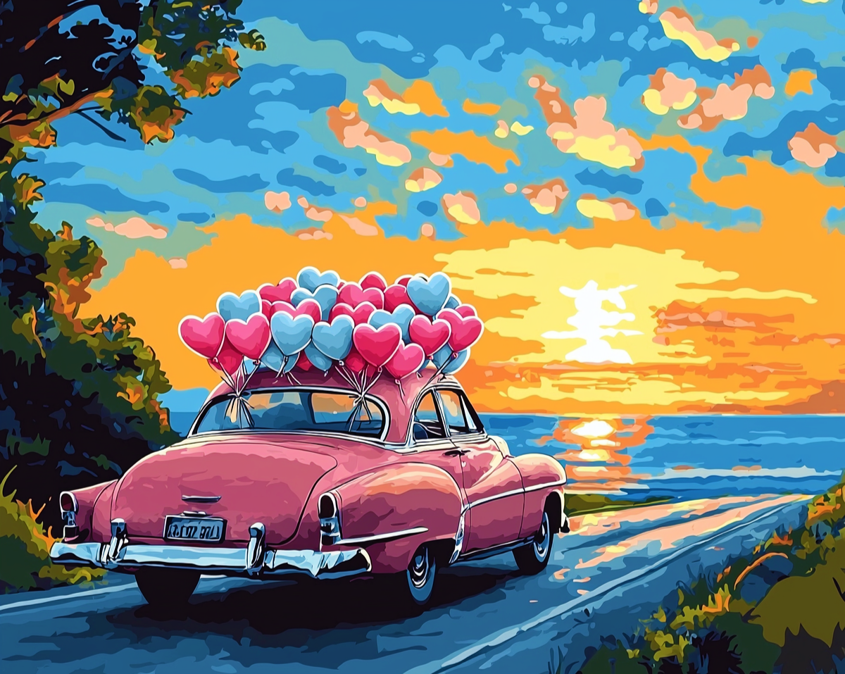 ماشین صورتی کلاسیک پر از بادکنکهای قلب، در جاده ساحلی زیر غروب نارنجی و رویایی.