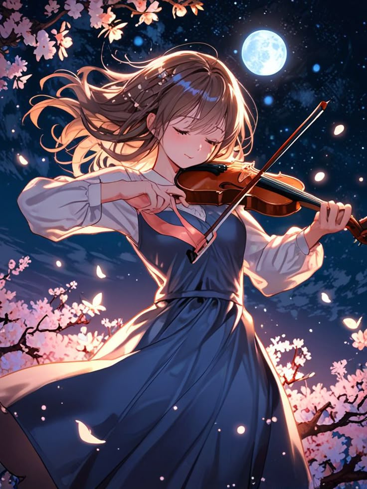 دختری با لباس آبی در حال نواختن ویولن میان شکوفههای شبانه ساکورا و ماه کامل؛ غم و زیبایی در یک لحظه.