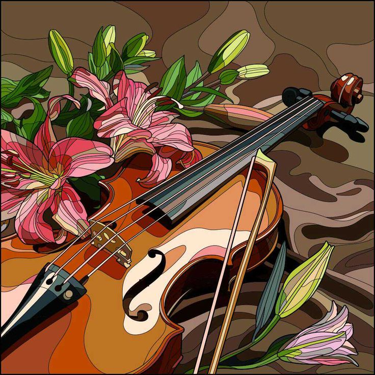 ویولنی چوبی گرم در آغوش گلهای سوسن صورتی، در پسزمینهای موجدار و رمانتیک؛ سمفونی عشق و موسیقی.