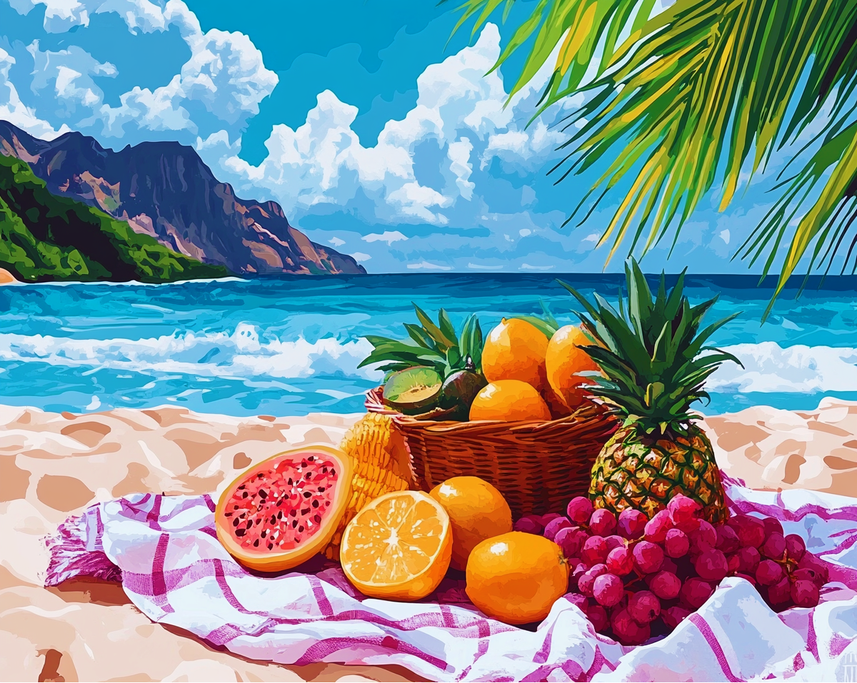 سبدی پر از میوههای رنگارنگ بر شنهای ساحل، طعم شیرین زندگی در نسیم دریا.