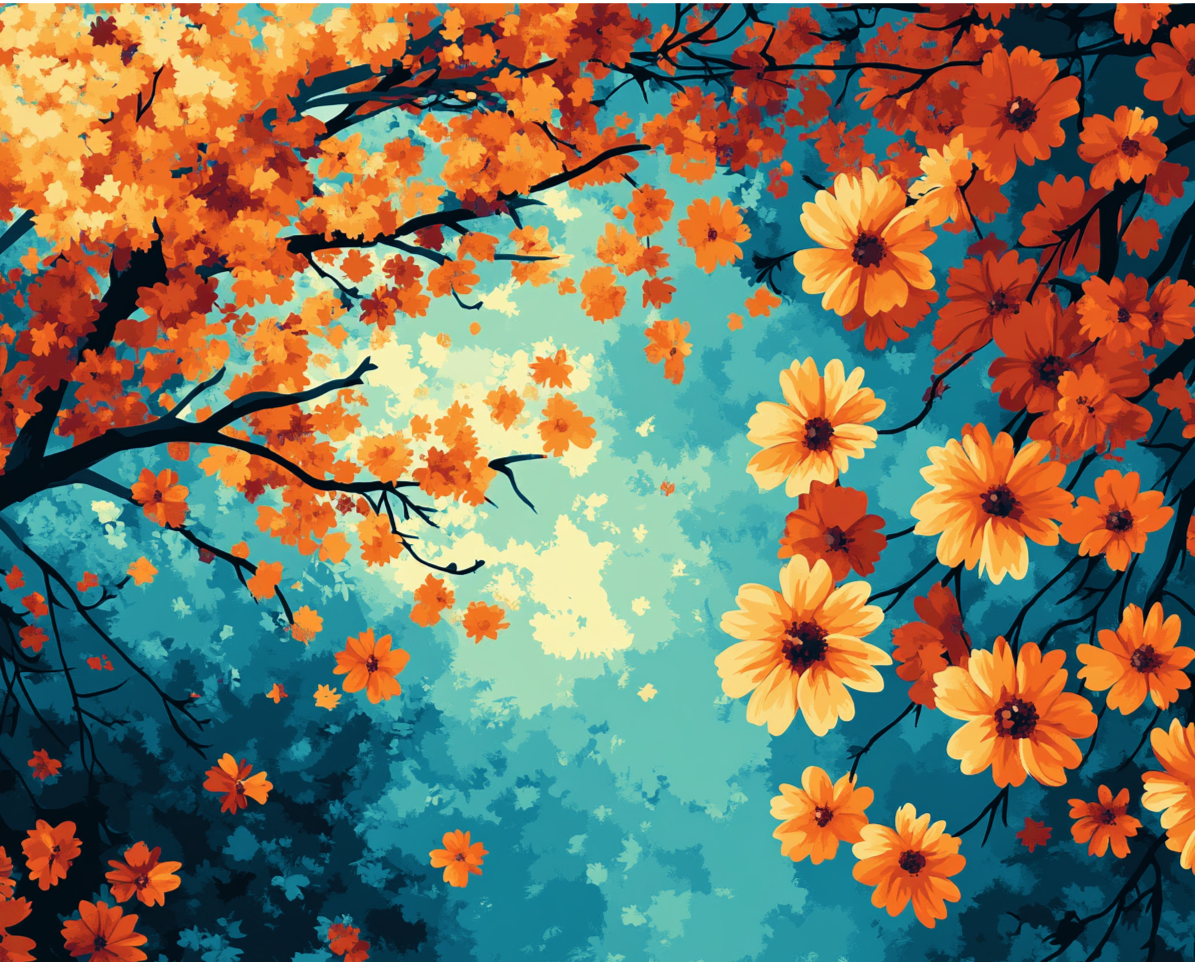 گلهای نارنجی و طلایی خورشید گون در میان شاخههای تیره، سرودی از گرما و امید در آبیِ بیپایان آسمان.