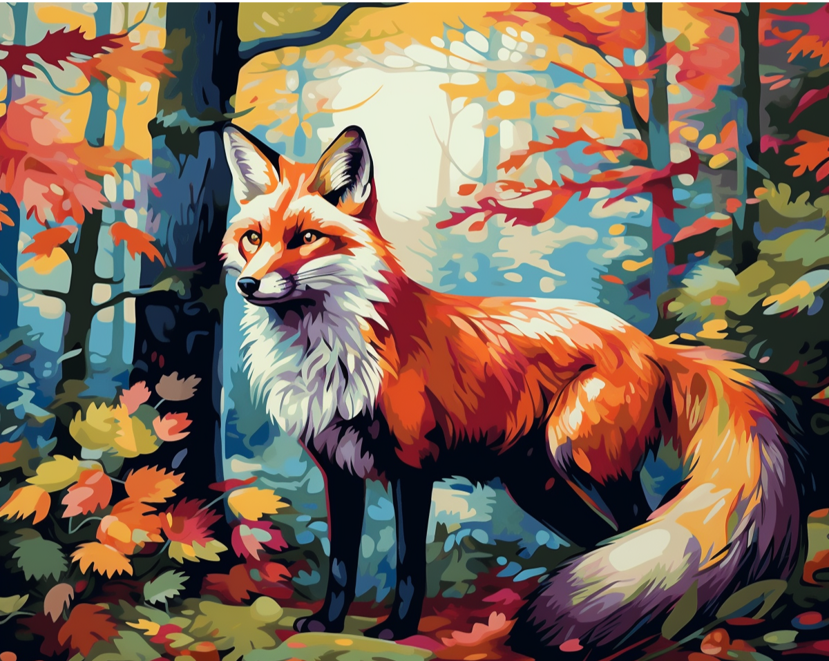 روباهی زیرک در دل جنگل پاییزی، همرنگ برگها و نور پاییزی، چنان که طبیعت خود او را در آغوش گرفته است.
